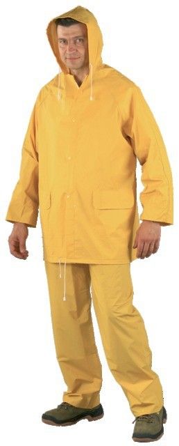 Dubults PVC pārklājums uz kokvilnas / poliestera atbalsta, kas padara šo lietus tērpu ūdensizturīgu.